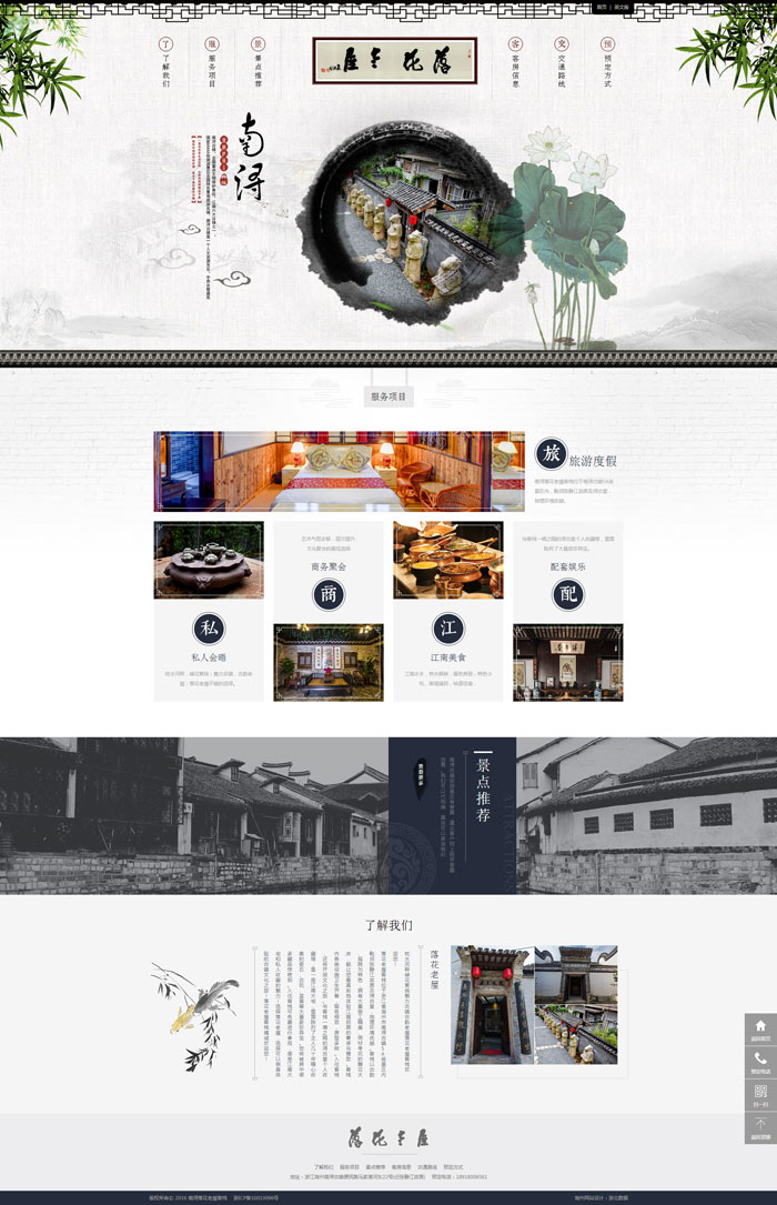 落花老屋定位在水鄉(xiāng)古鎮(zhèn)高端旅游度假酒店,網(wǎng)站在視覺(jué)設(shè)計(jì)上極力營(yíng)造一種古色古香的懷舊時(shí)尚感。灰色、類(lèi)似青磚色的應(yīng)用,以及古典的窗欞、竹子、書(shū)法匾額、老式屋檐等各種元素的融合,先確立了一個(gè)古典的基調(diào)。