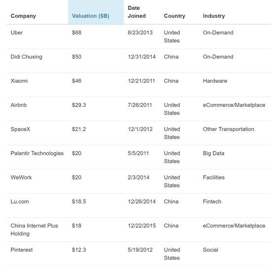 滴滴出行以500億美元的估值奪得榜眼之位,小米以460億美元的估值榮登探花。陸金所作為一家金融資產交易公司被估值185億美元,位居第八。新美大(美團網與大眾點評網15年合并后的新名稱),估值為180億美元,排在第九位。此外,今日頭條、摩拜、OfO、蔚來汽車等公司今年新晉入圍。
